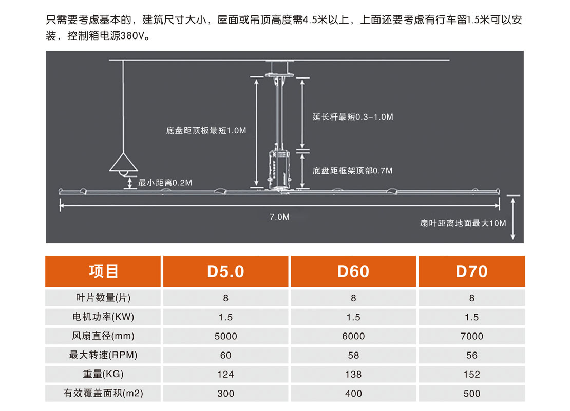 大型工業(yè)吊扇直徑達5-7米,功率為1.5千瓦,風力柔和、無噪音,能滿足200-500平方米的室內降溫、通風等要求。