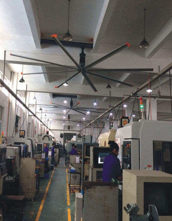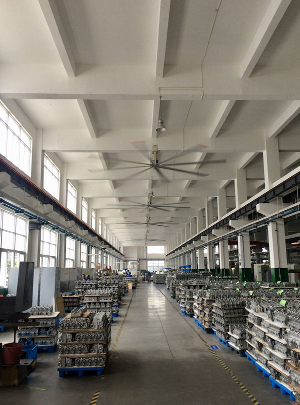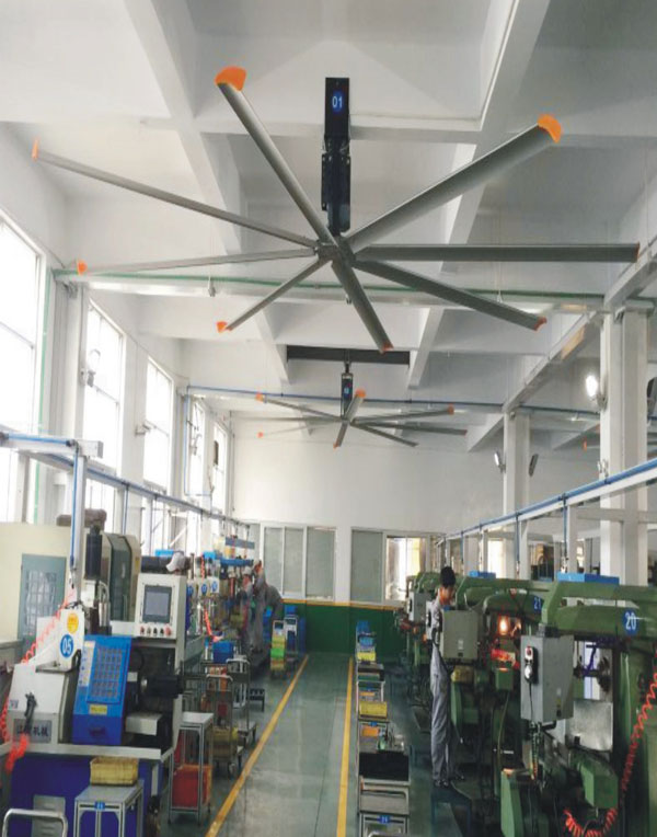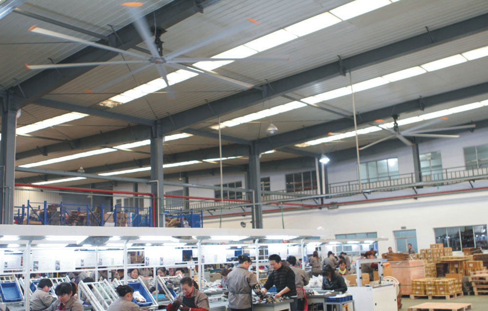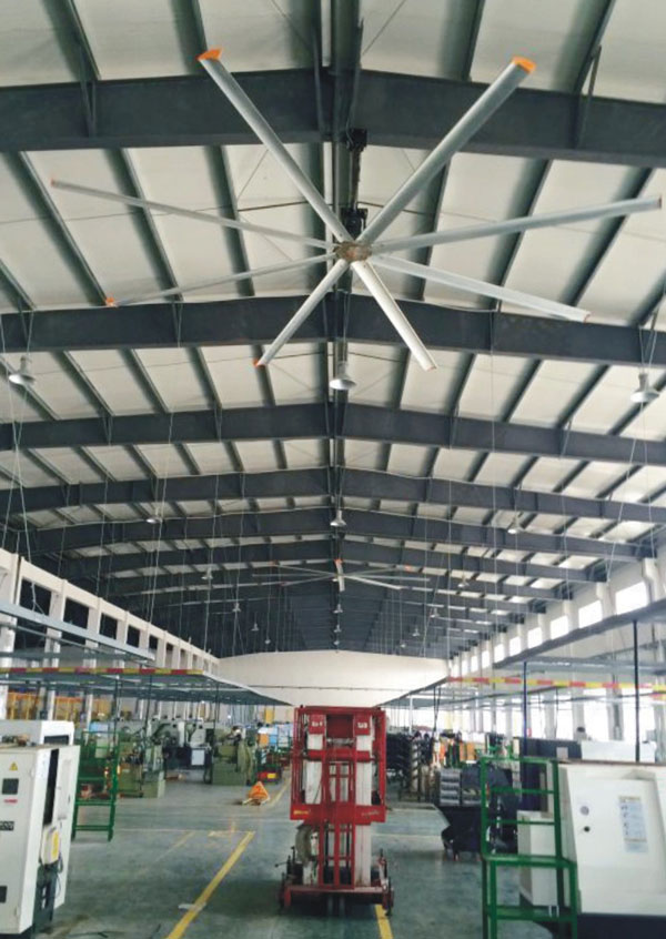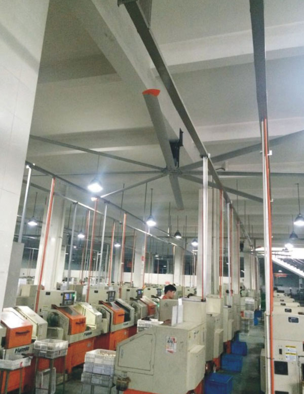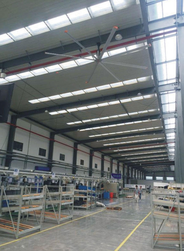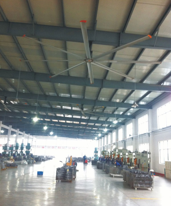 我公司生產的大型工業(yè)吊扇直接懸掛在廠房屋梁下,風力柔和,能加快車間空氣流通,有效降低車間內溫度,改善車間空氣環(huán)境質量,有利于員工的身體健康。