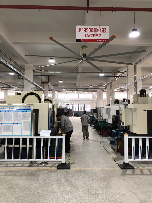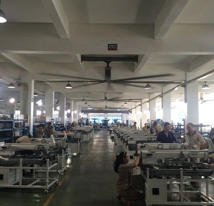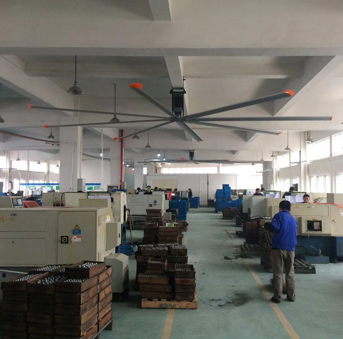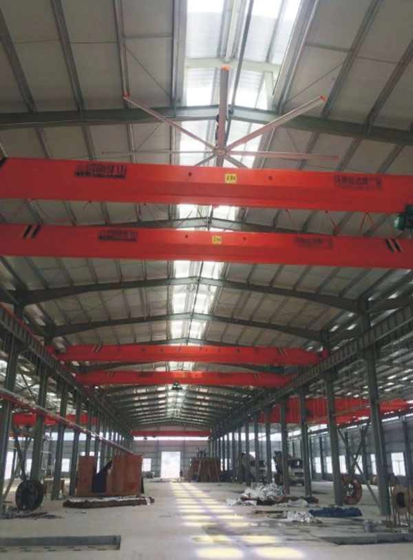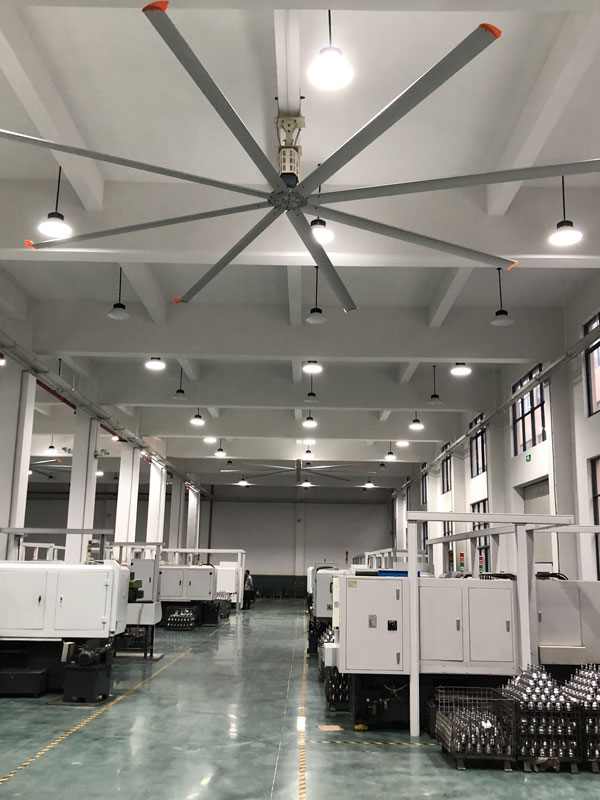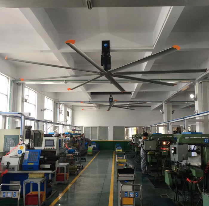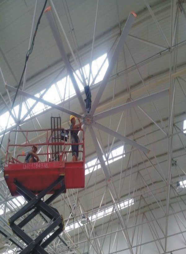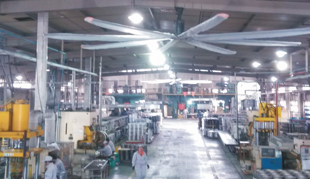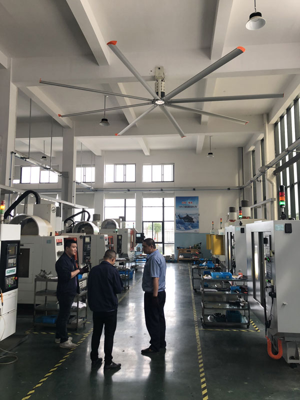我公司生產的大型工業(yè)吊扇直接懸掛在廠房屋梁下,風力柔和,能加快車間空氣流通,有效降低車間內溫度,改善車間空氣環(huán)境質量,有利于員工的身體健康。